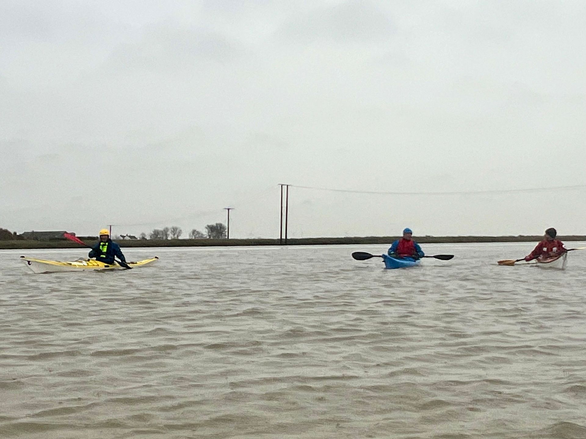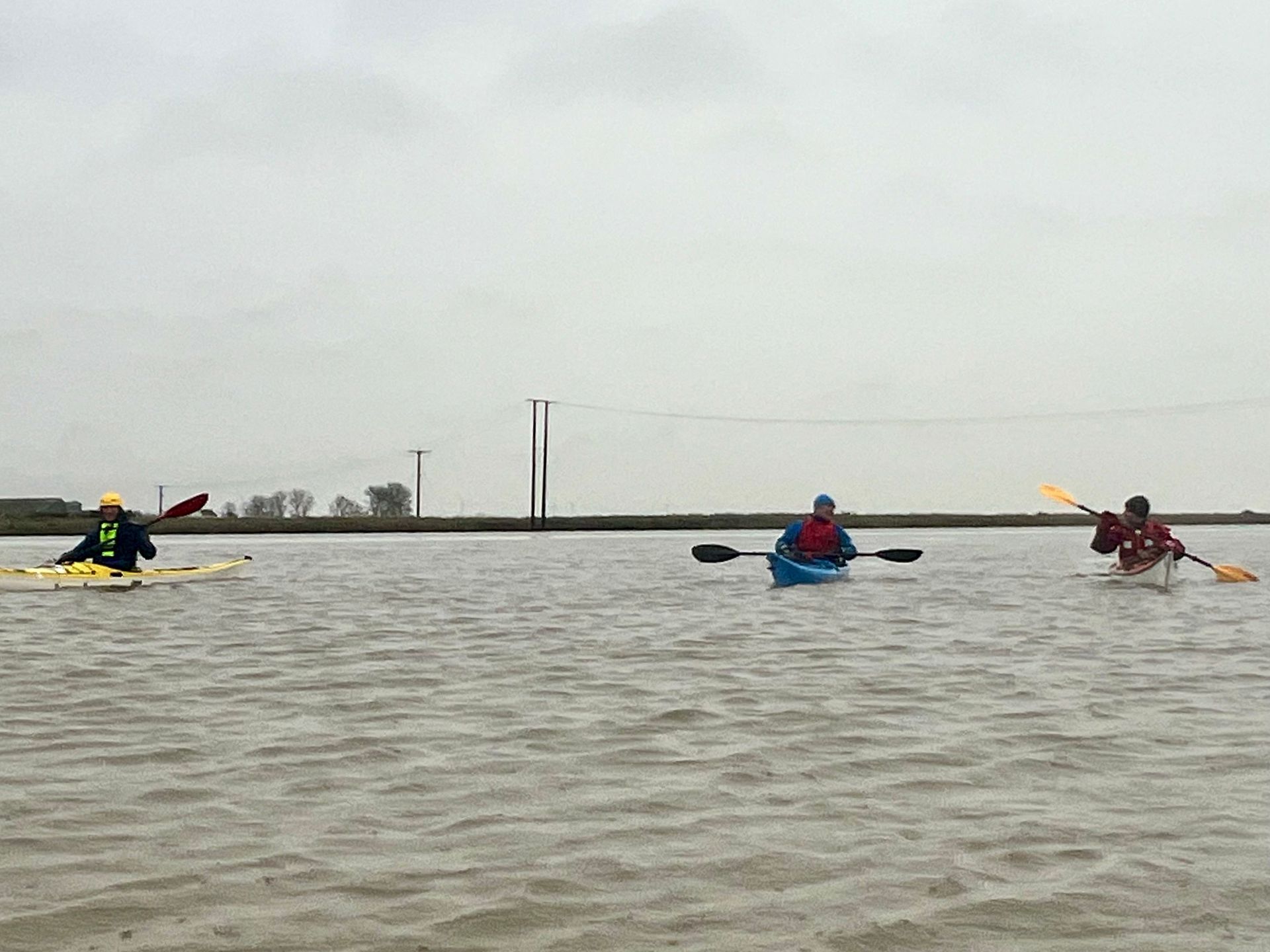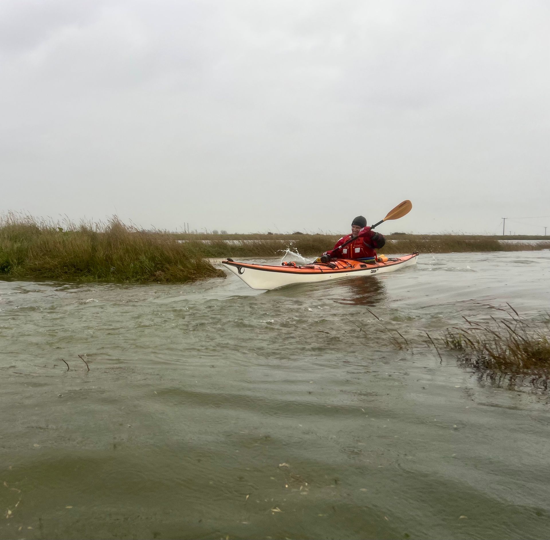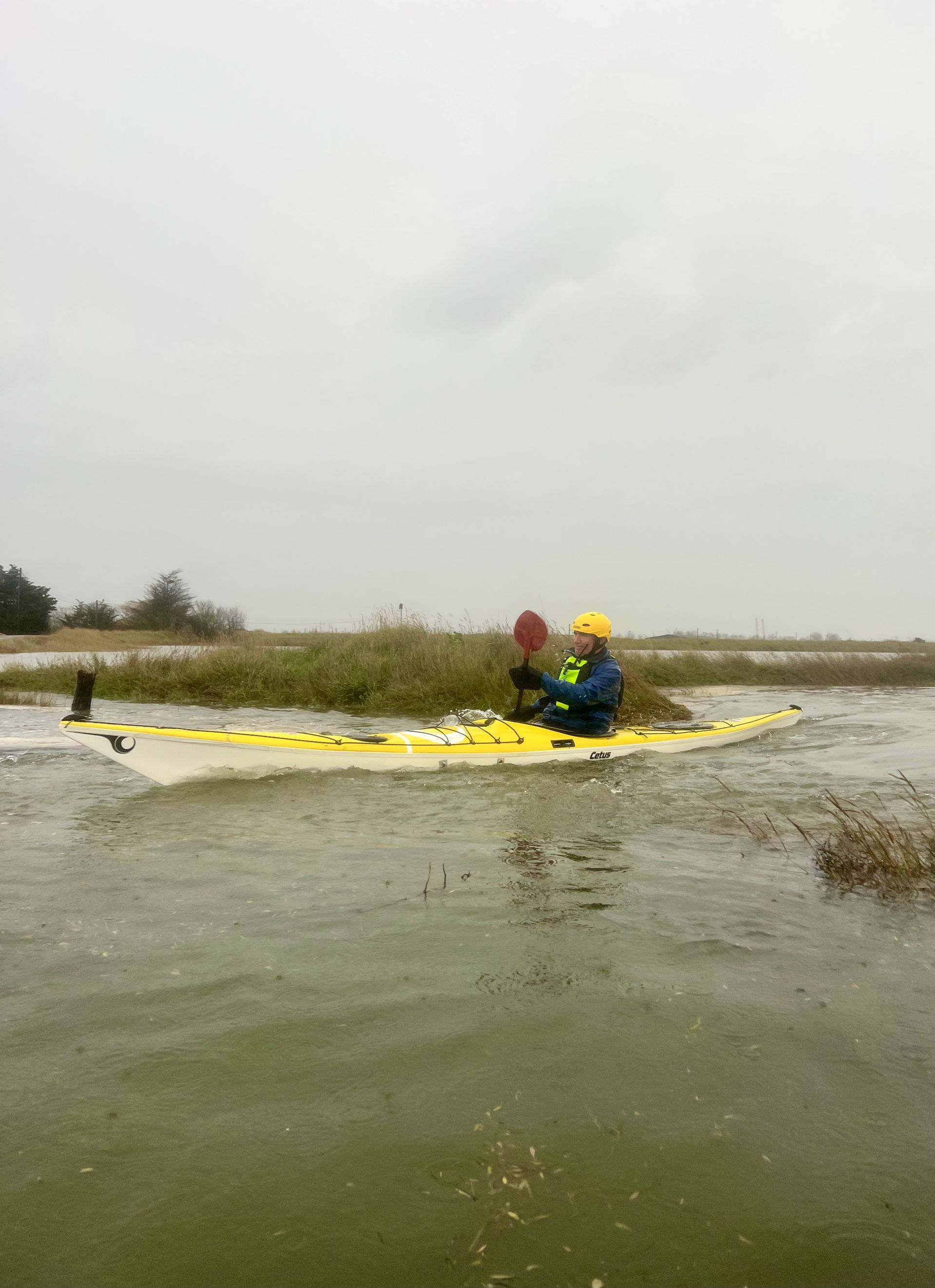 Sunday 7th December saw the 2nd biggest daytime high tide of the year, so 5 members of the club grabbed the opportunity to hopefully experience the novelty of paddling across the main road to the island! A grey morning with a stiff south easterly meant that we were into the tide and the wind on the first leg down the Crouch. Turning the corner into the Roach brought little respite despite now having the tide with us. The wind over tide made the main channel quite choppy. Those paddling closer to the edge of the river benefitted from slightly smoother water, but less tide assistance. Further on, as we turned more westwards towards Pagglesham, we were greeted by many seals slithering down the mud into the water. They then reappeared like aquatic meerkats keeping a wary eye on us. Further up the river, we pulled ashore at Pagglesham for lunch, but the wind and low temperature meant that we didn’t stay long!