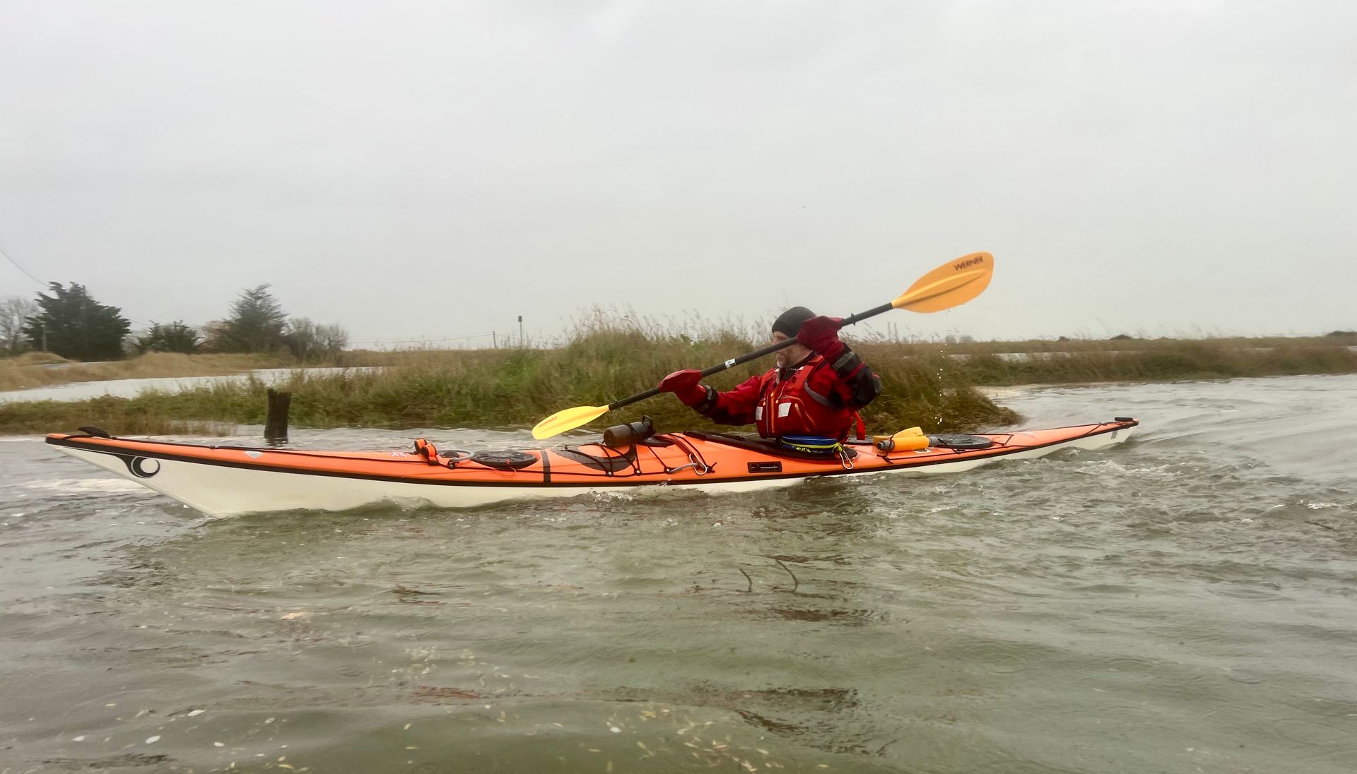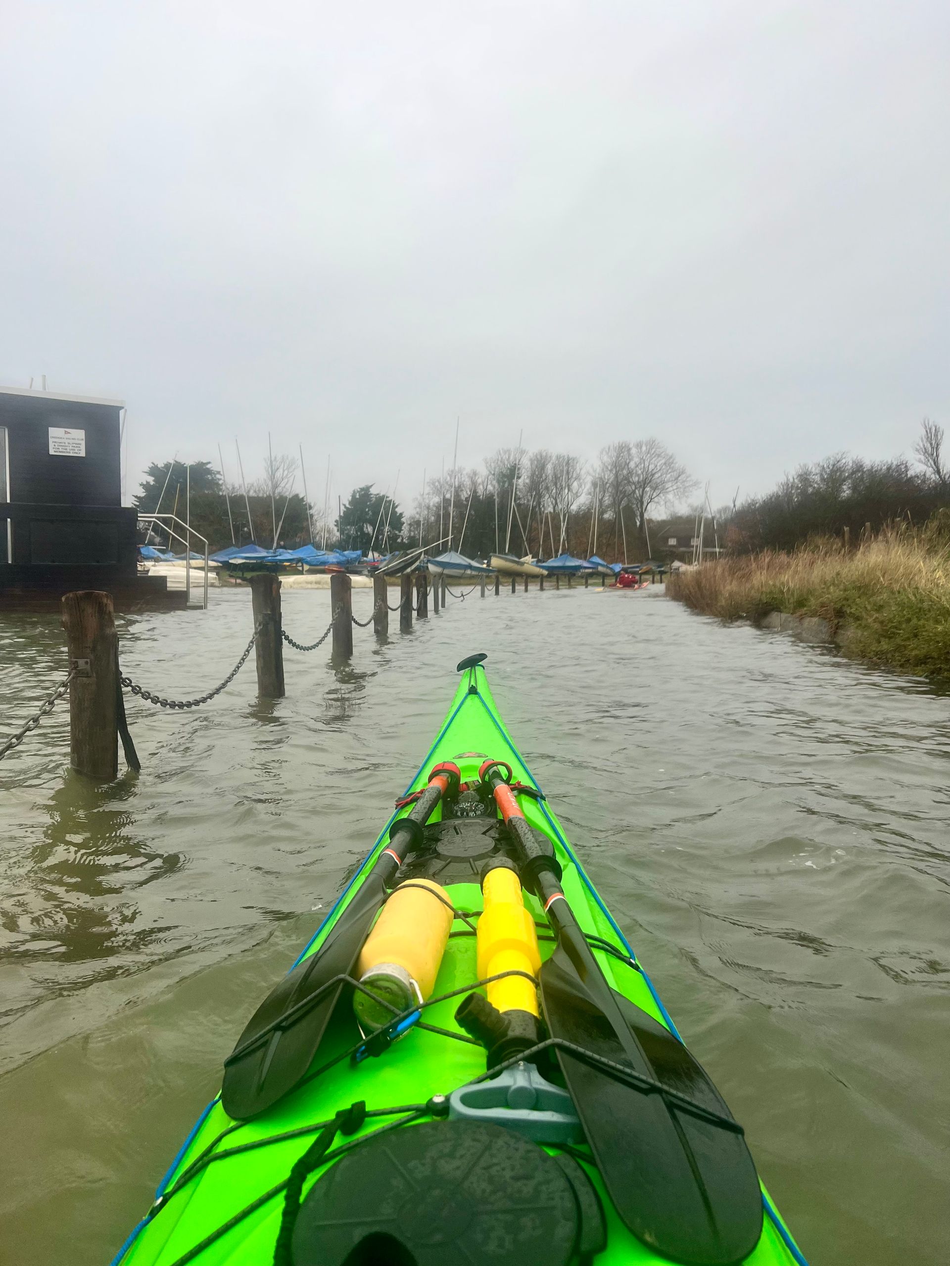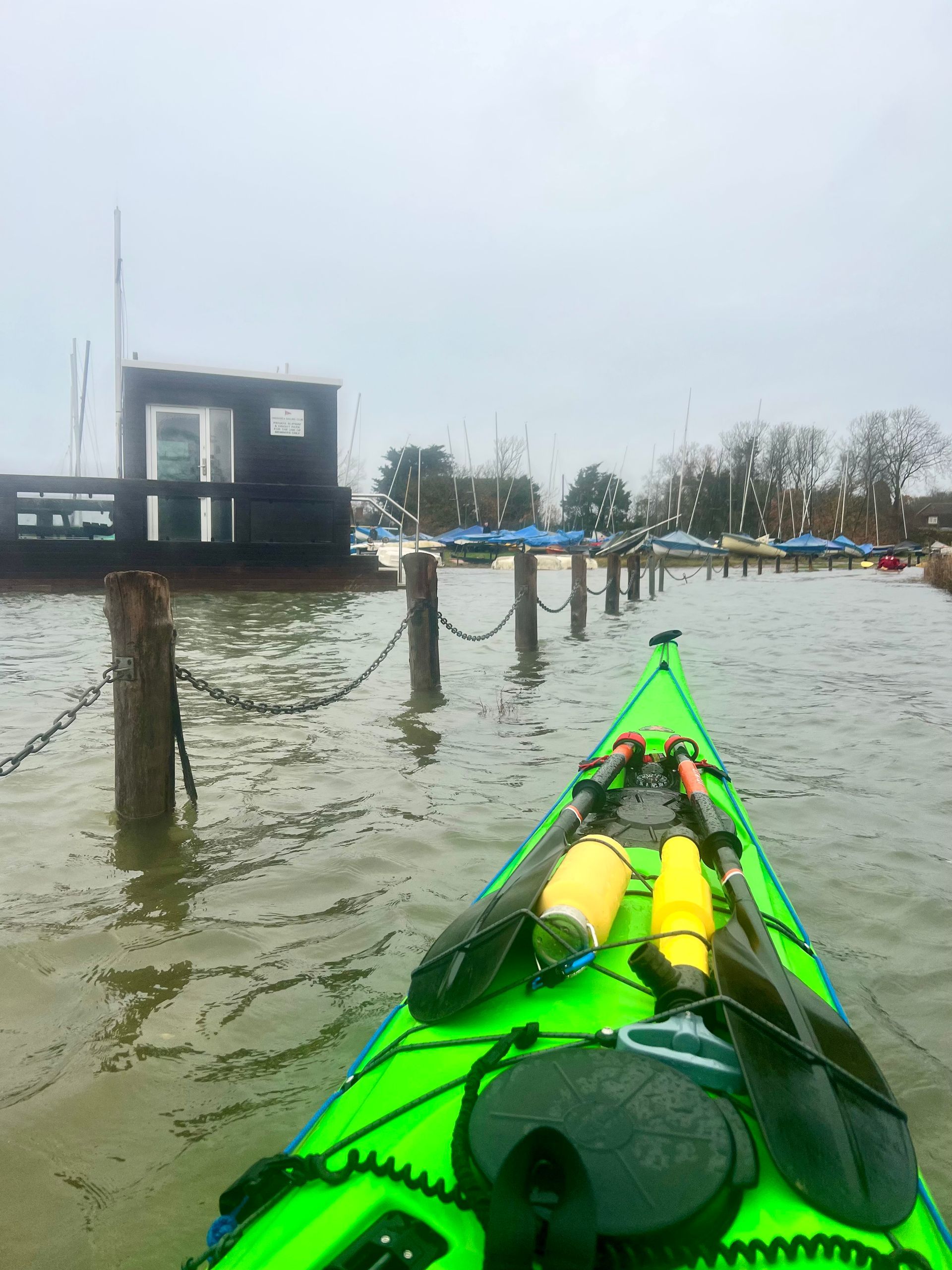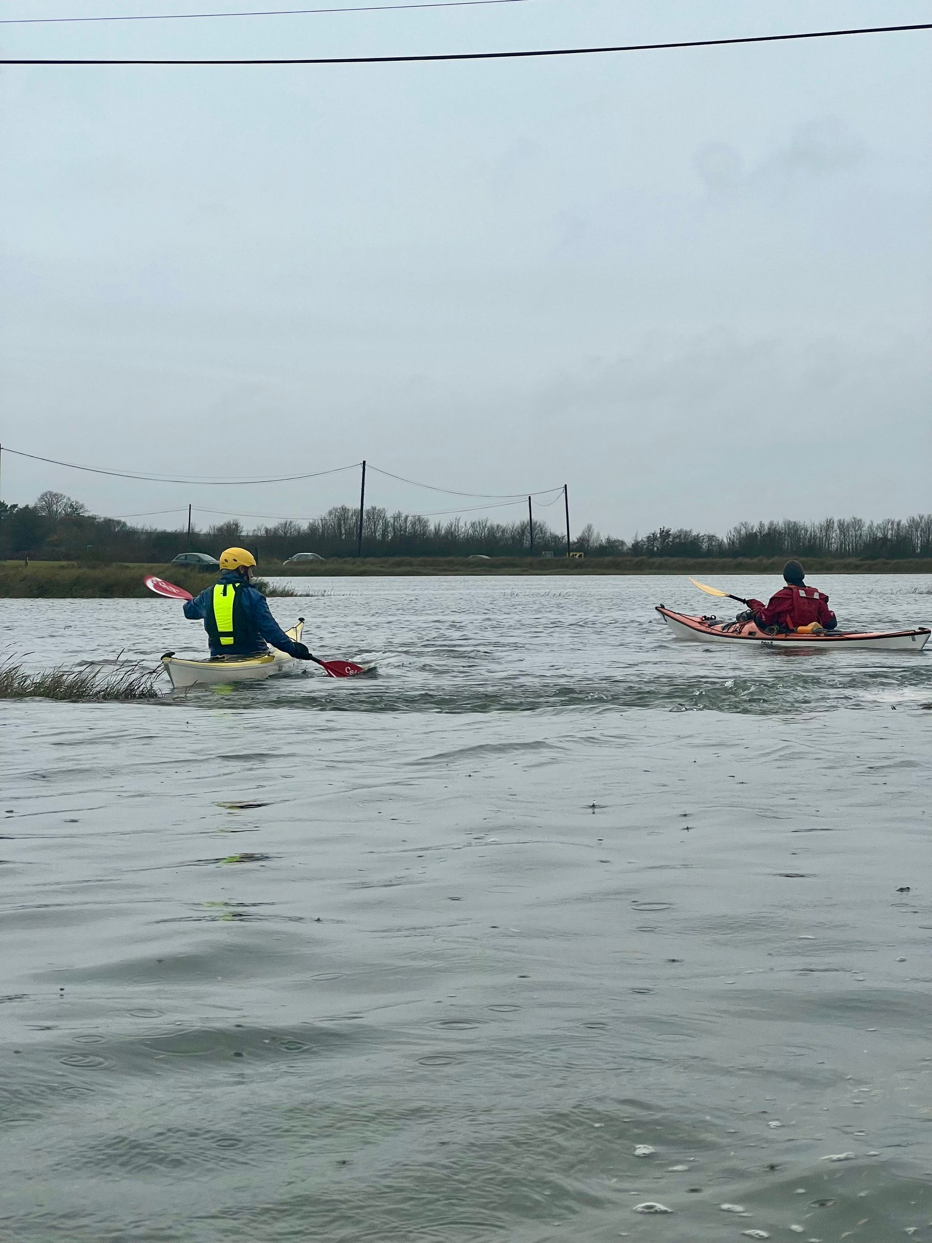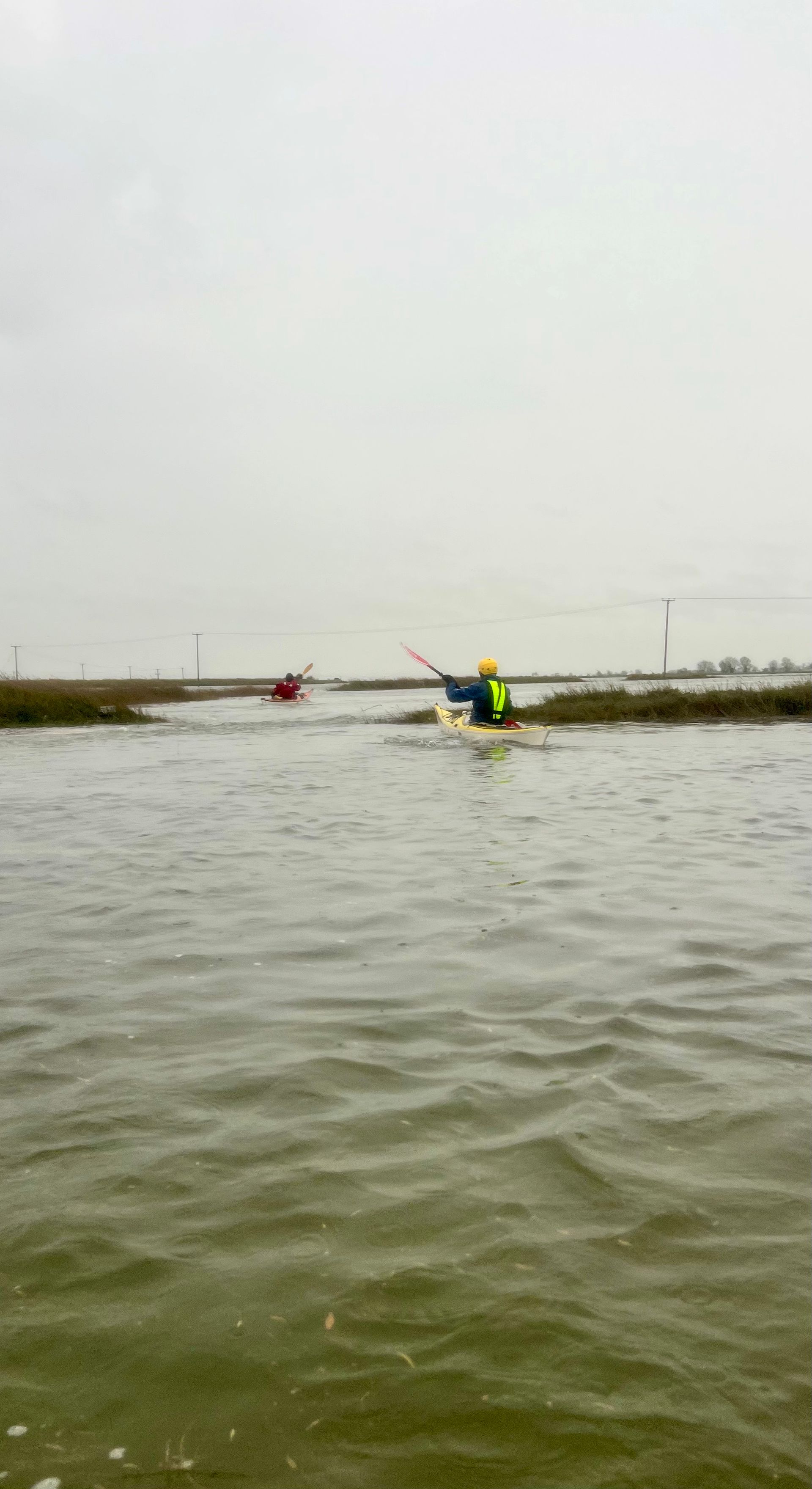 Sunday 7th December saw the 2nd biggest daytime high tide of the year, so 5 members of the club grabbed the opportunity to hopefully experience the novelty of paddling across the main road to the island! A grey morning with a stiff south easterly meant that we were into the tide and the wind on the first leg down the Crouch. Turning the corner into the Roach brought little respite despite now having the tide with us. The wind over tide made the main channel quite choppy. Those paddling closer to the edge of the river benefitted from slightly smoother water, but less tide assistance. Further on, as we turned more westwards towards Pagglesham, we were greeted by many seals slithering down the mud into the water. They then reappeared like aquatic meerkats keeping a wary eye on us. Further up the river, we pulled ashore at Pagglesham for lunch, but the wind and low temperature meant that we didn’t stay long!