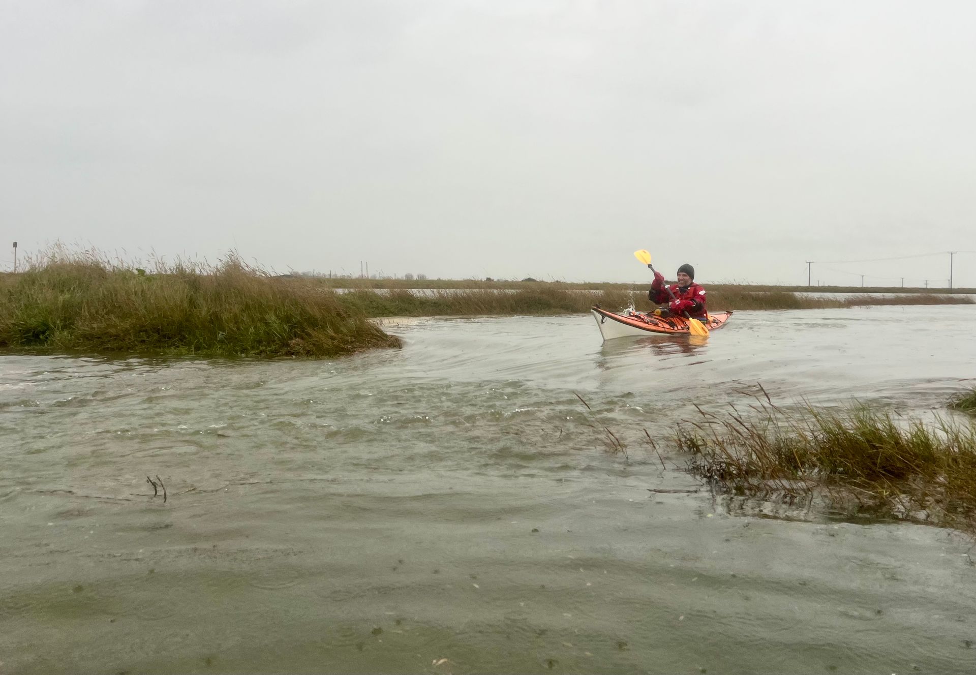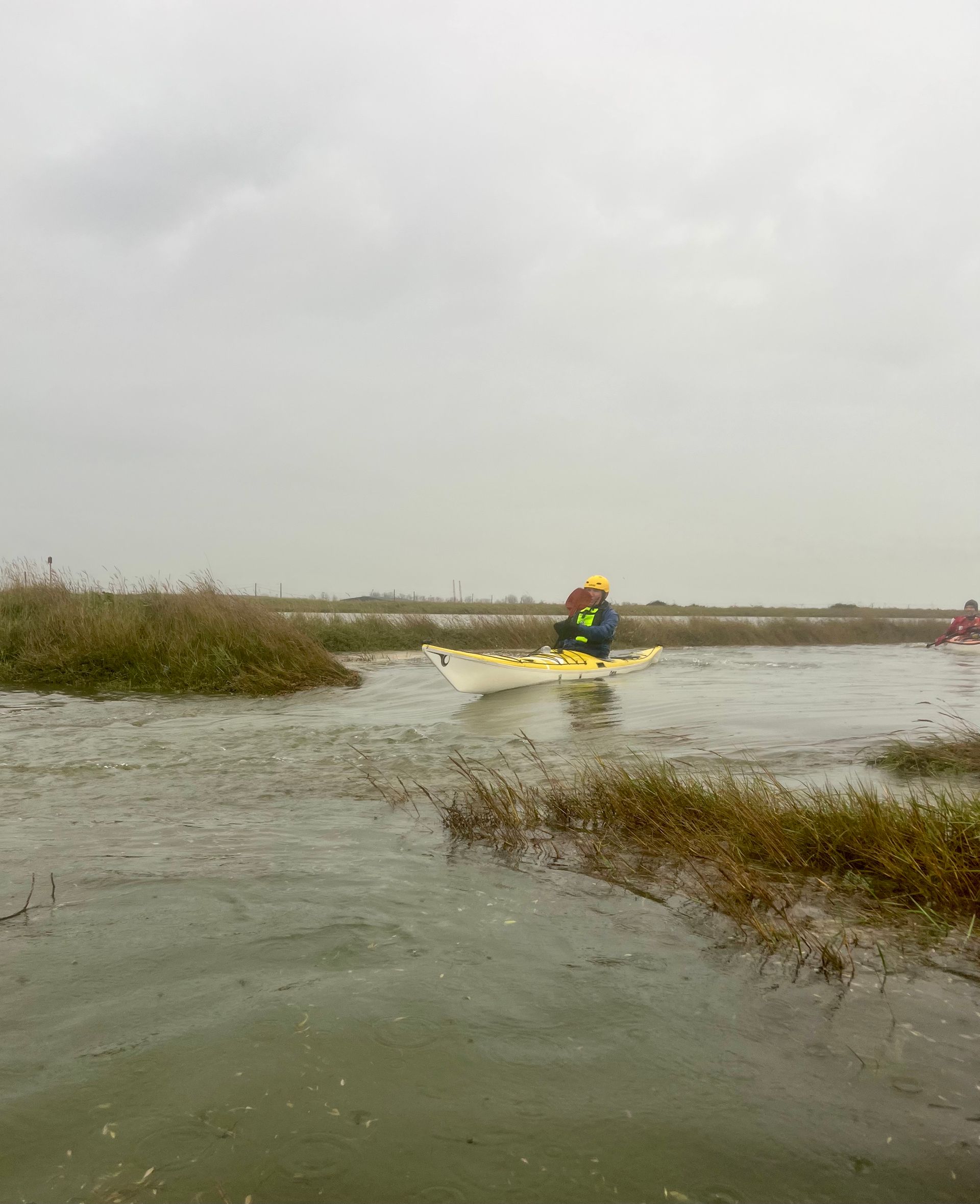 Next back to Pagglesham creek to paddle towards the road to Wallasea. The wind and tide were now behind us, pushing us along nicely. The height of the tide allowed us to take a shortcut across the saltings to the road. To our surprise, the water in Pagglesham Creek was around 100mm higher than in Lion’s Creek, creating a narrow stream of fast moving water across the road. Great fun was had, breaking out into the eddies on the road, then practising our kayak control and acceleration to paddle back up from the road into the higher water of Pagglesham Creek. After 20 minutes or so of playing here watched by car drivers stranded by the flood, we headed off down Lion’s Creek towards the Crouch.