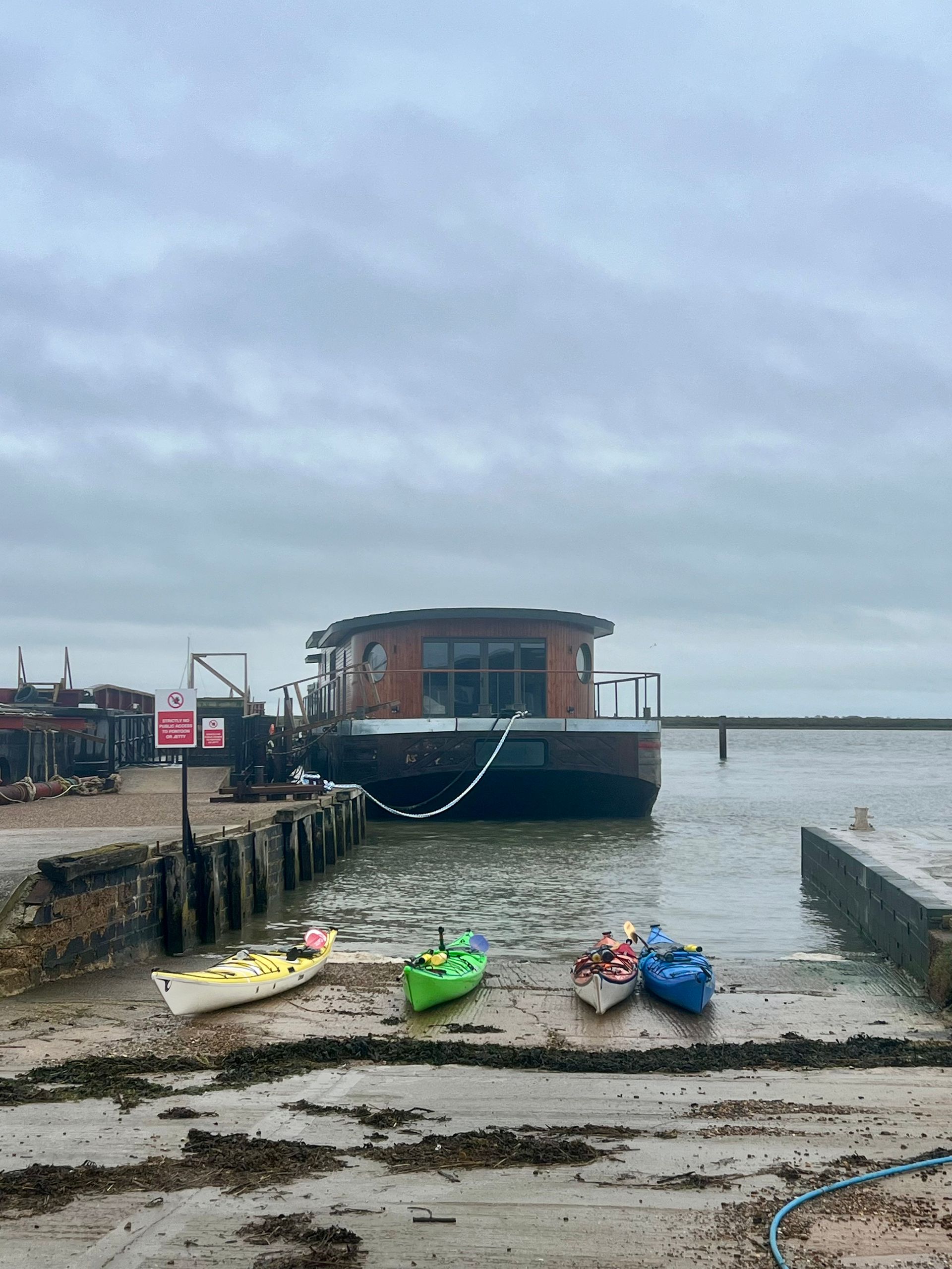 Next mission was to cross to Creeksea, to try to paddle along the road there too! Bizarrely, the tide was pushing up gently upstream on the first half of the crossing. The north side of the river was already ebbing fast! We were disappointed on arrival at Creeksea! Not only could we paddle a long way up the lane alongside the dinghy park there, but we were able to do the second circumnavigation of the day, this time round the Creeksea Sailing Club race hut!